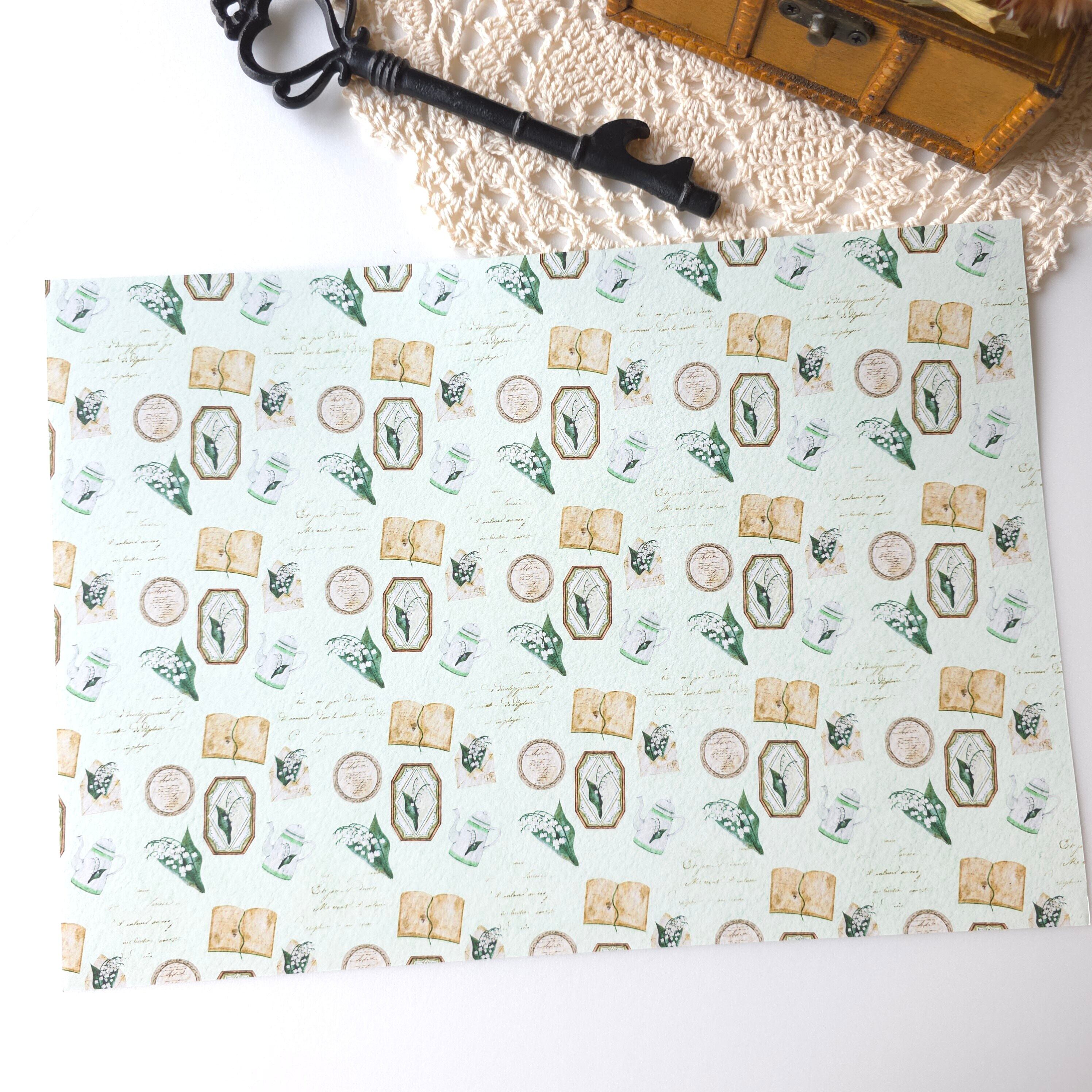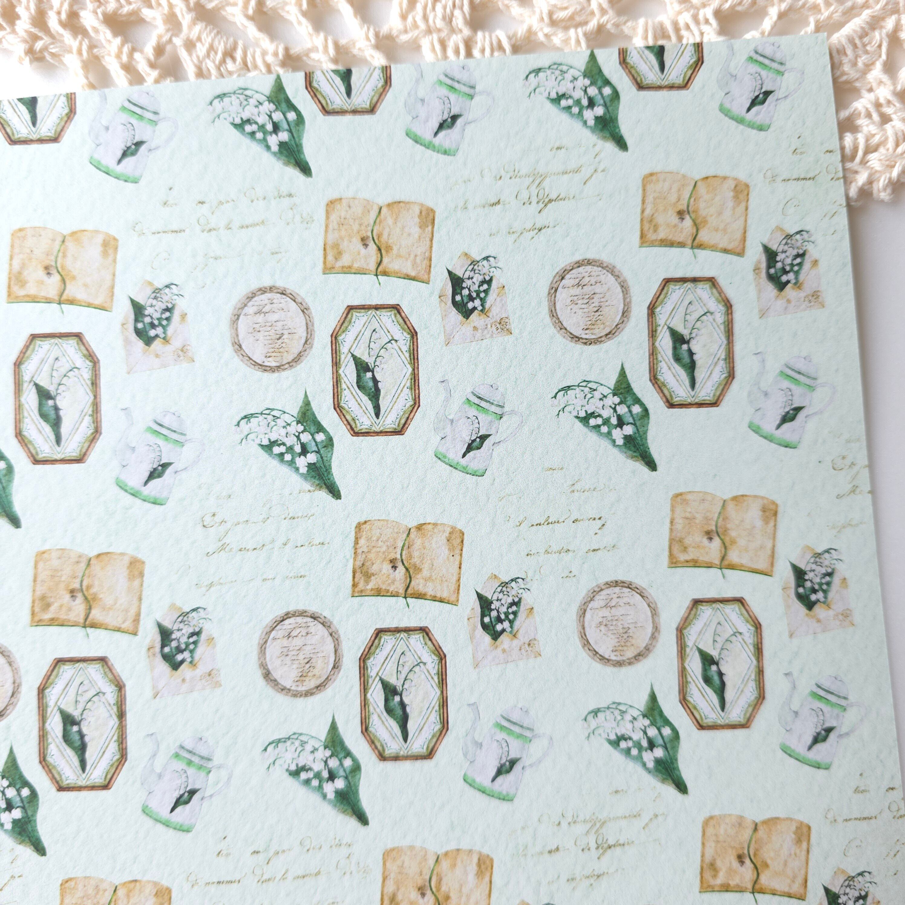 すずらん、フレーム、レター、本、ティーポットなどのモチーフをパターン風にデザインしました。モチーフはフレンチ風なインテリアからインスピレーションを受けて描きました。