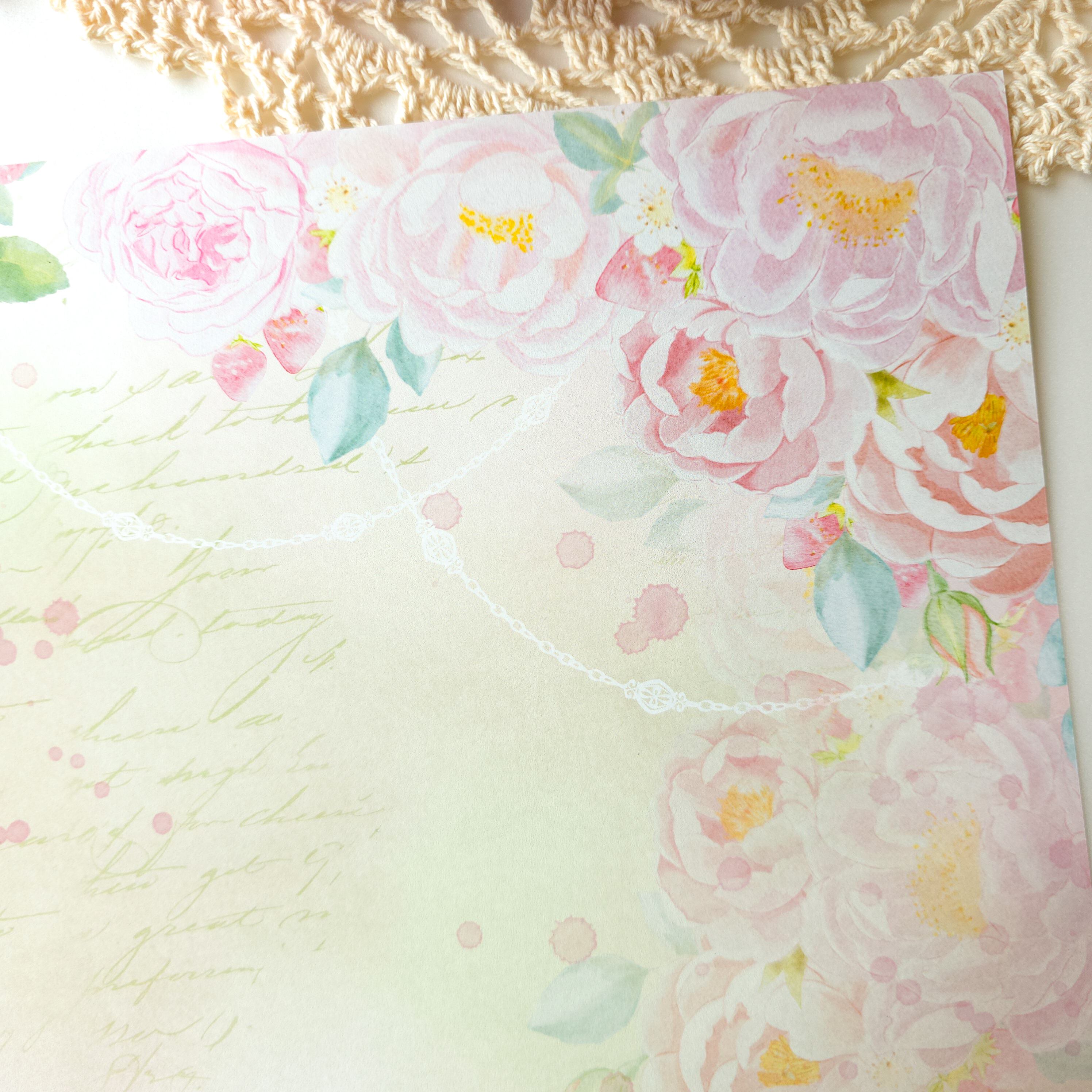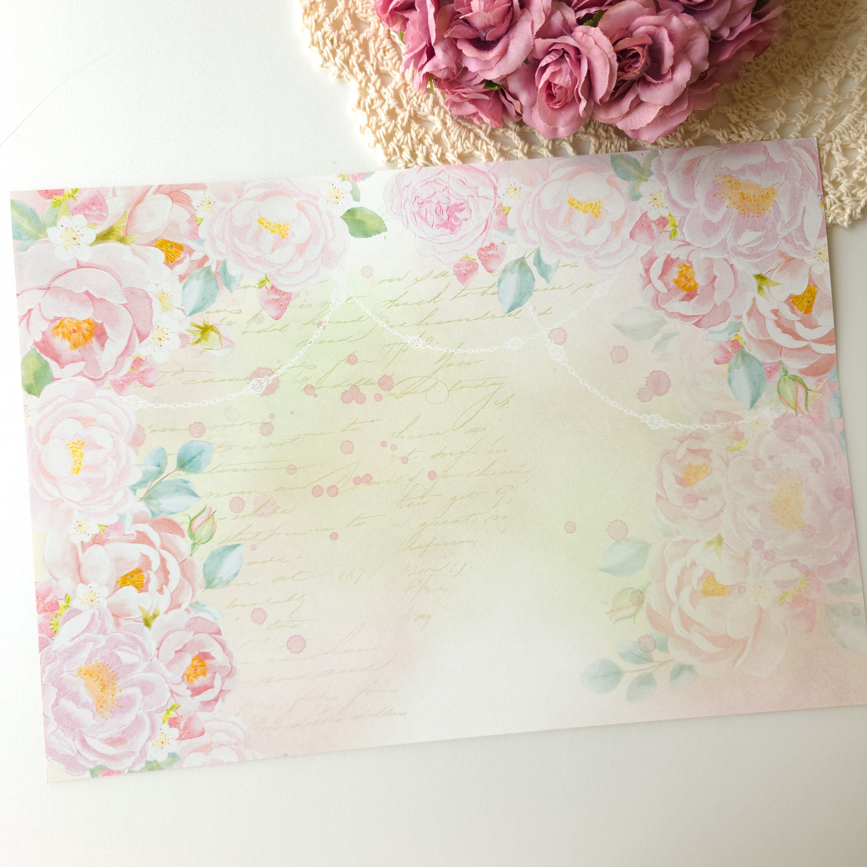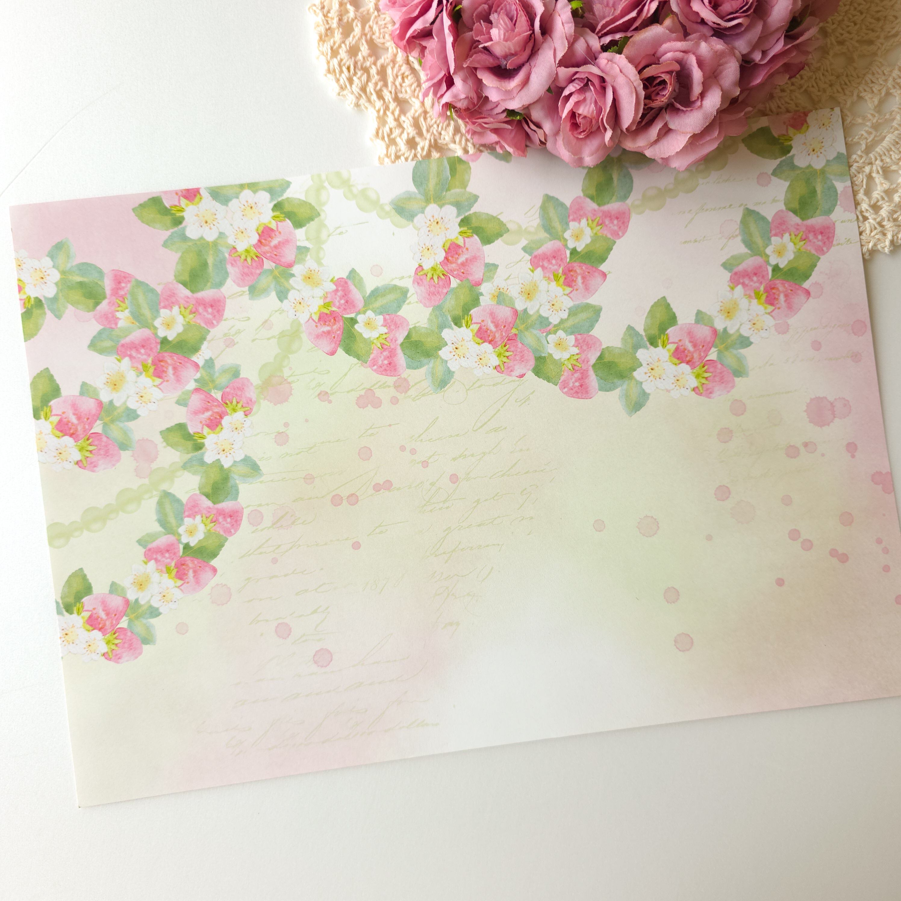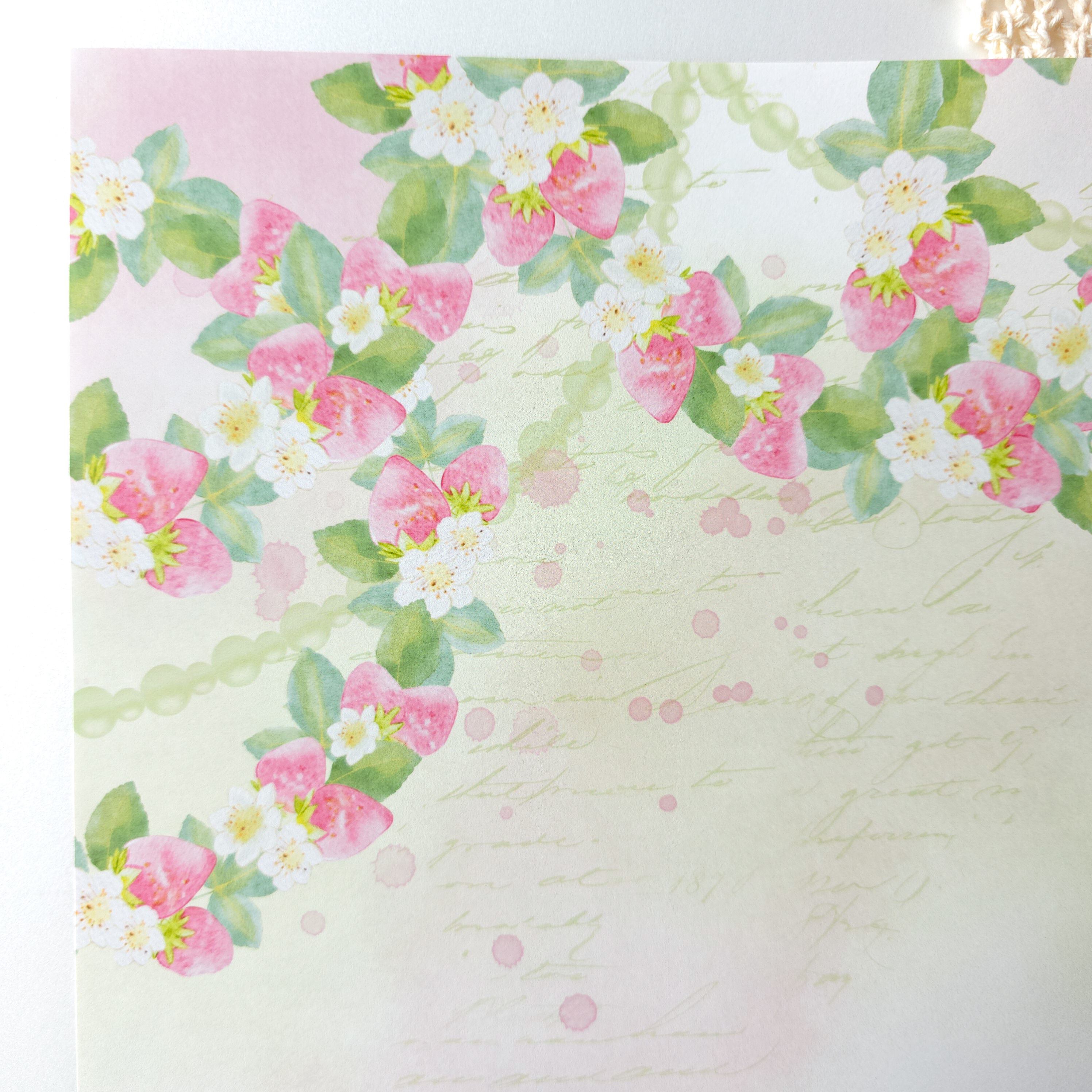 いちごと芍薬、バラを組み合わせた華やかで可愛いらしいデザインペーパーです。