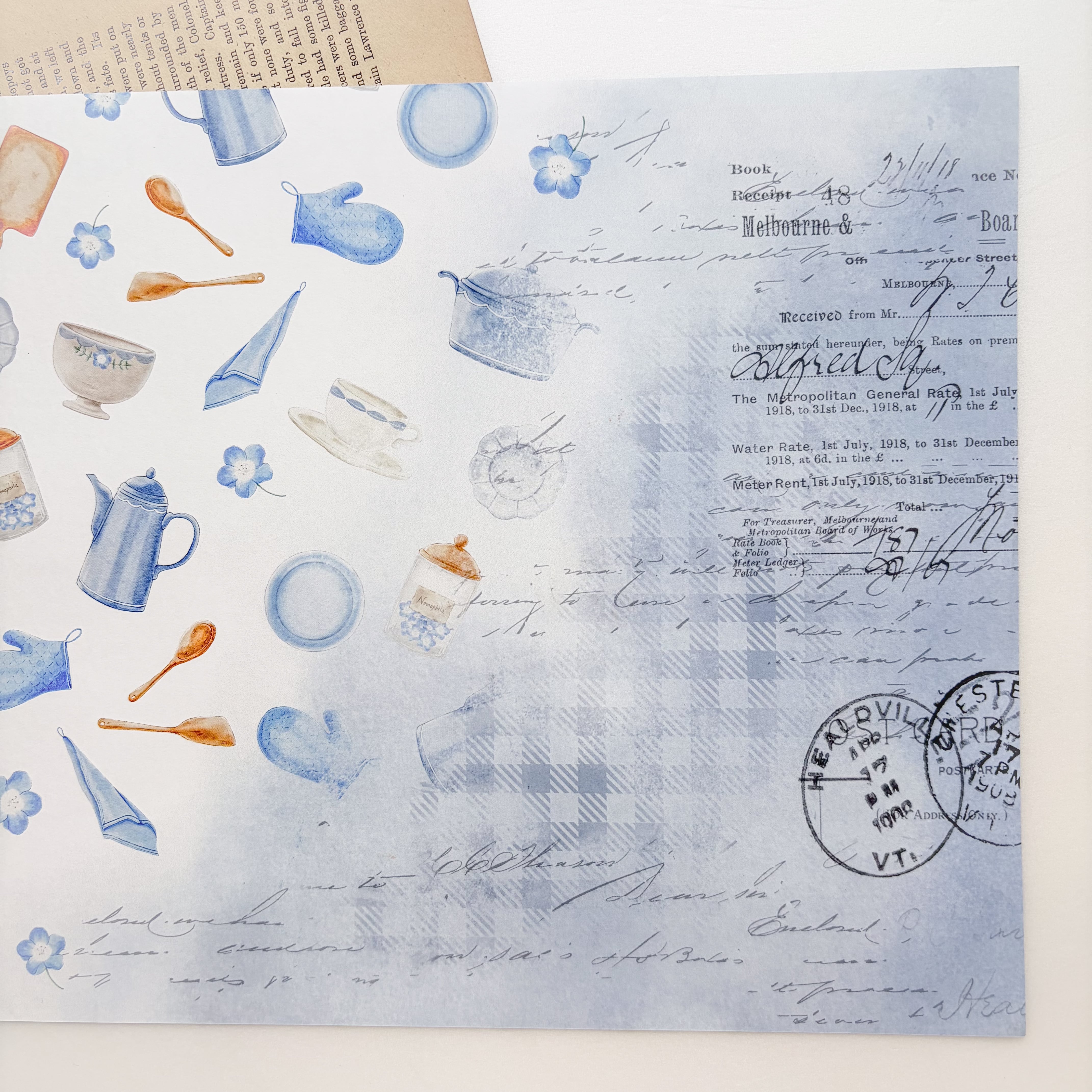 今回のテーマ「ネモフィラ×キッチン」なのでキッチンにあるモチーフたちが模様として彩る表面と、ネモフィラが上下に配置されたシンプルなデザインの裏面。