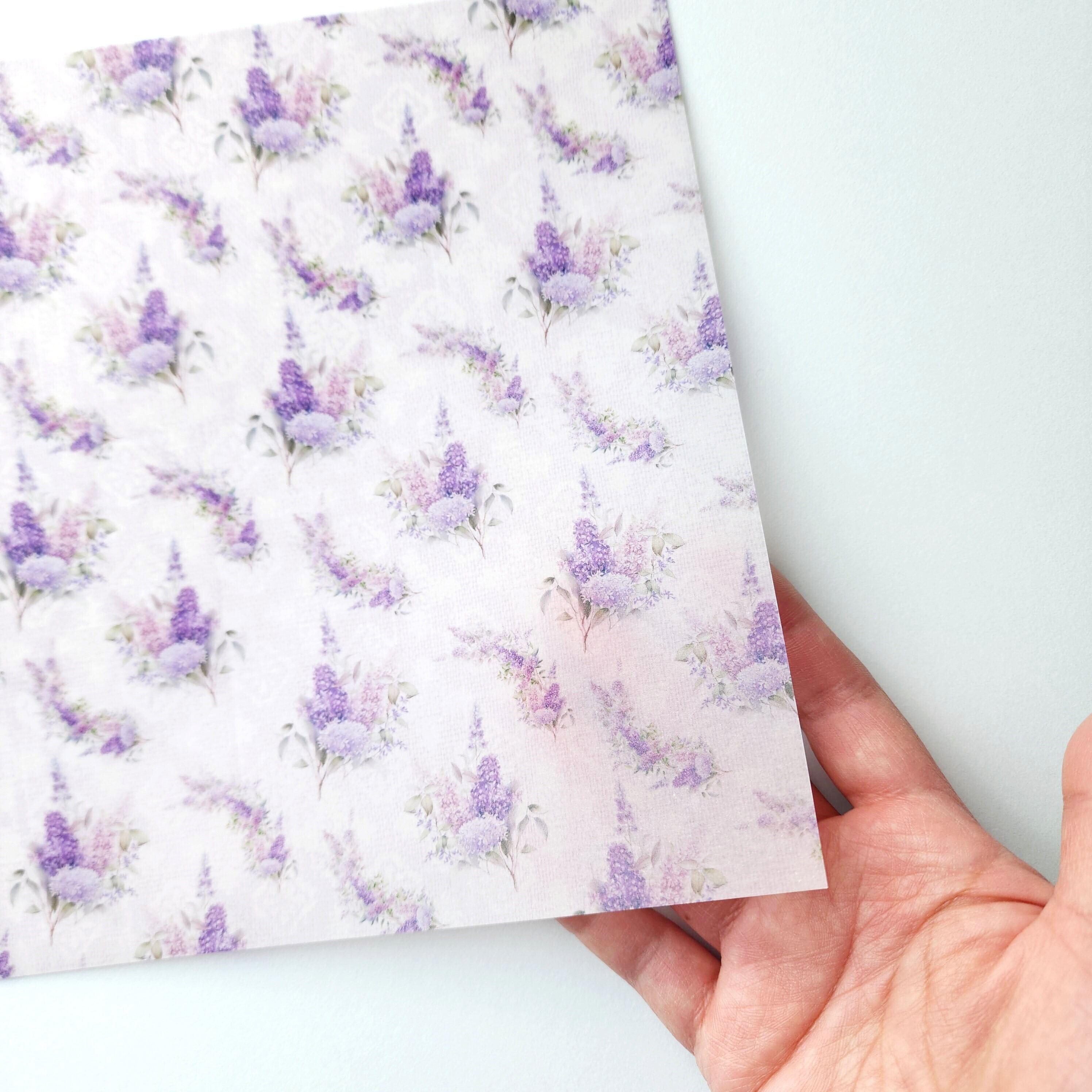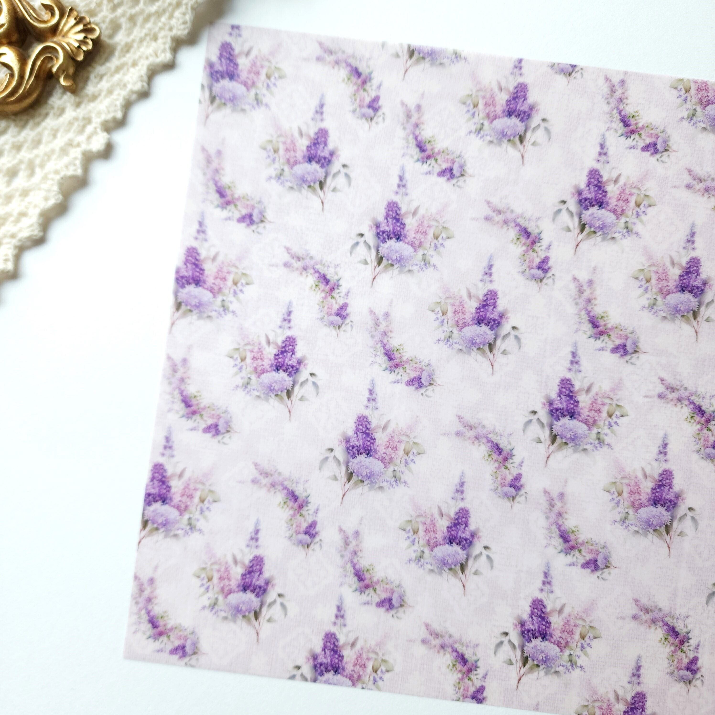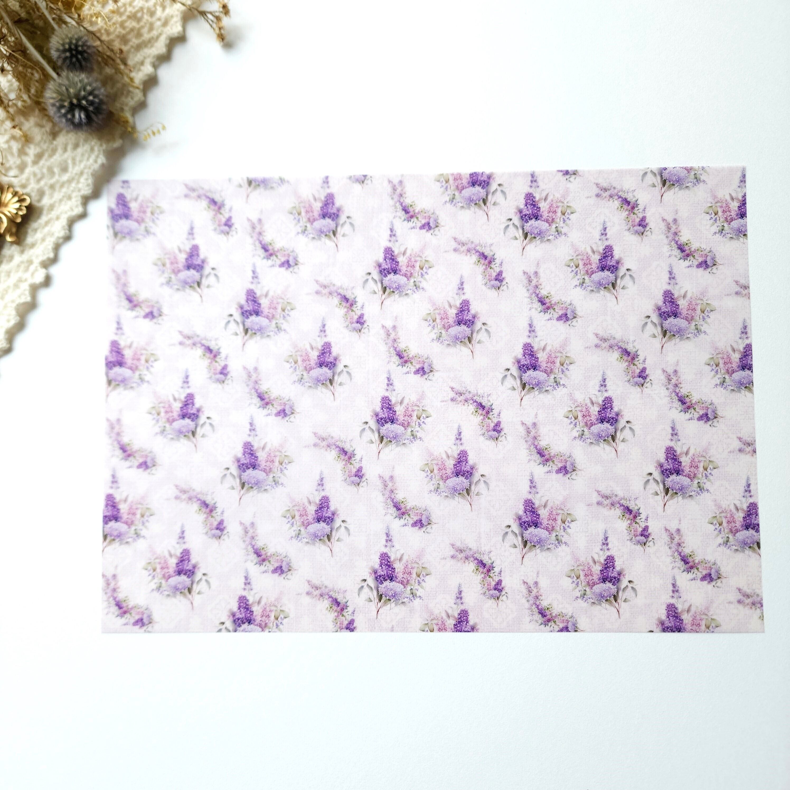 ベースの紫色は模様入りのリネン生地風で、その上にライラックがパターン風に並んでいるデザインとなります。