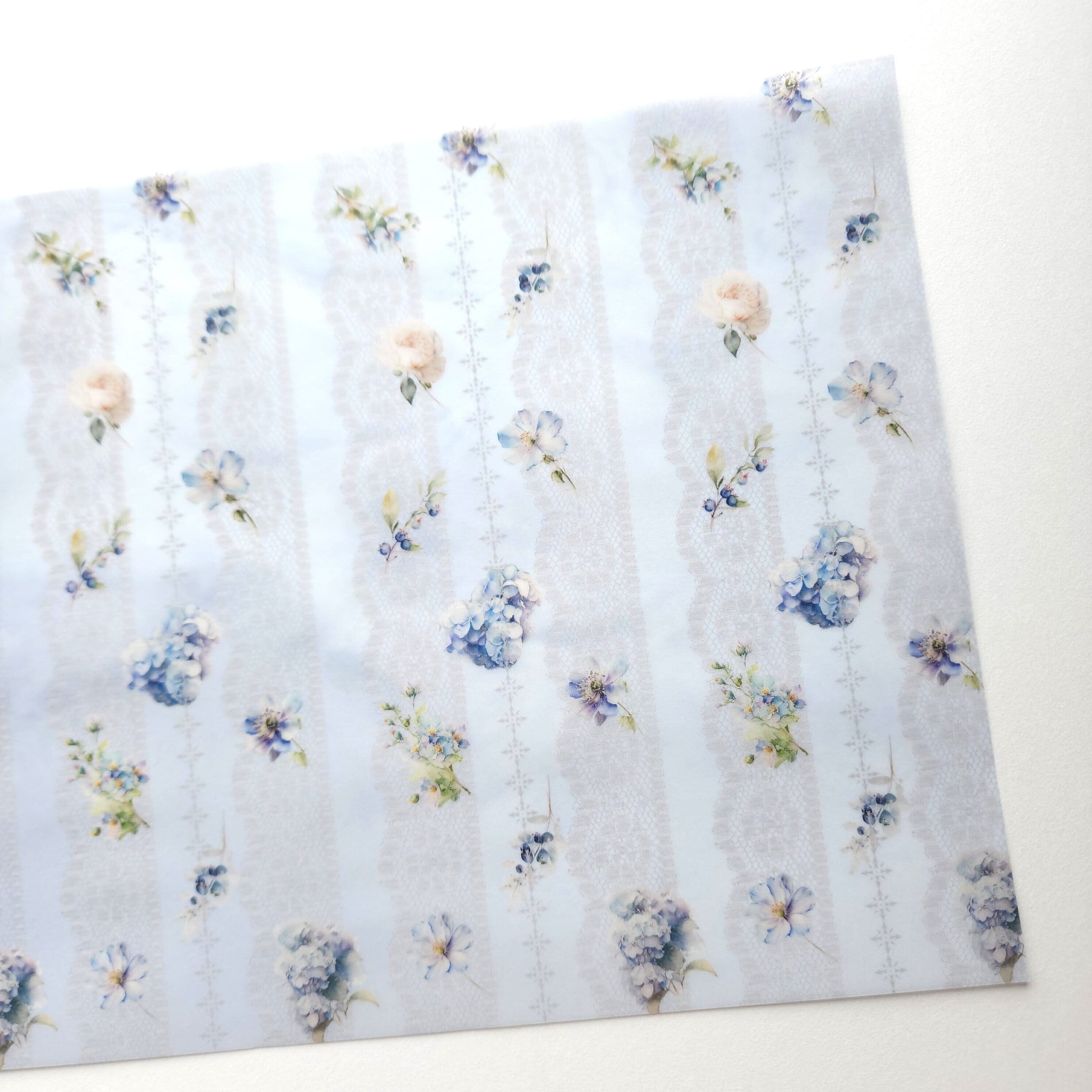 優しいブルーにレースを施し、お花を散りばめたトレーシングペーパーです。