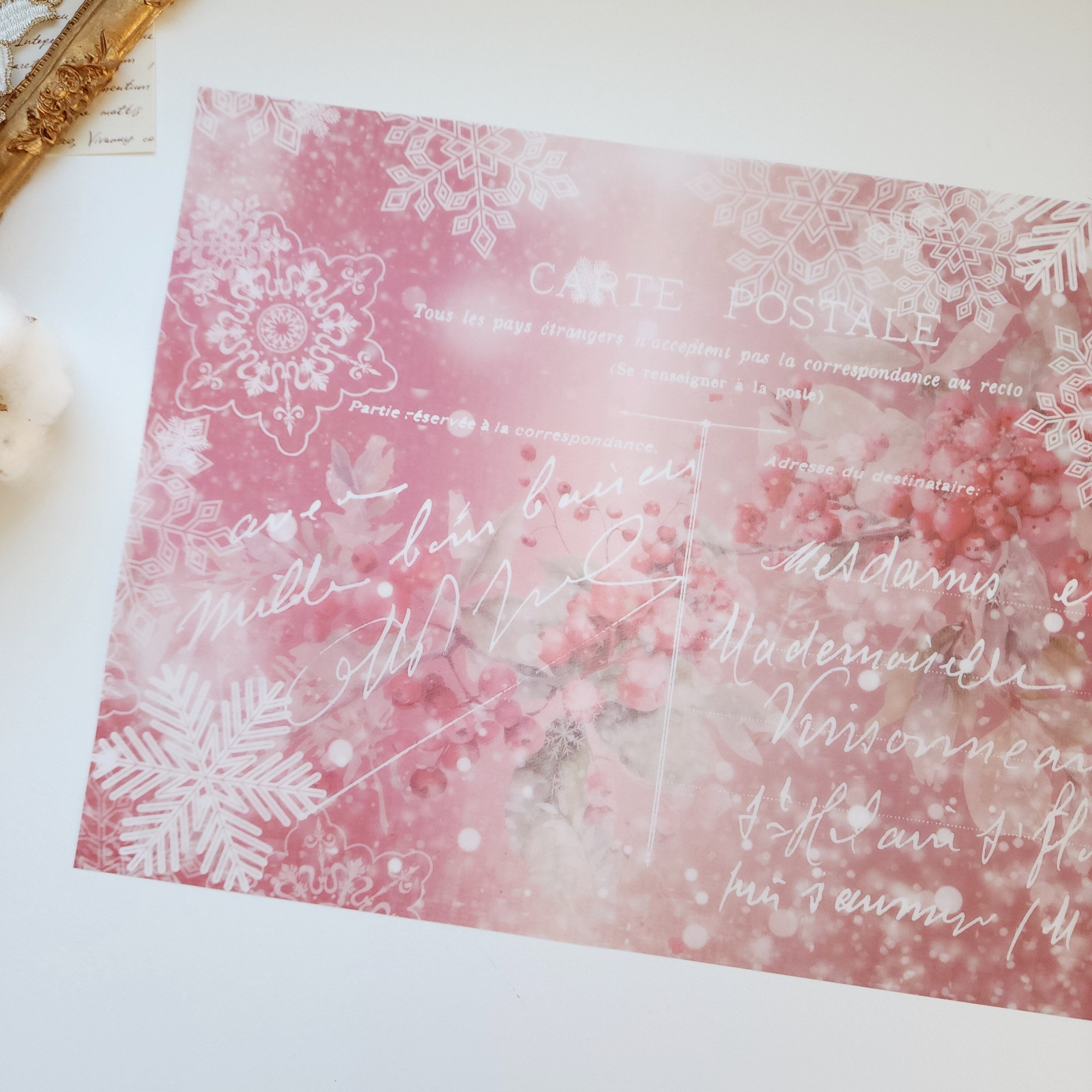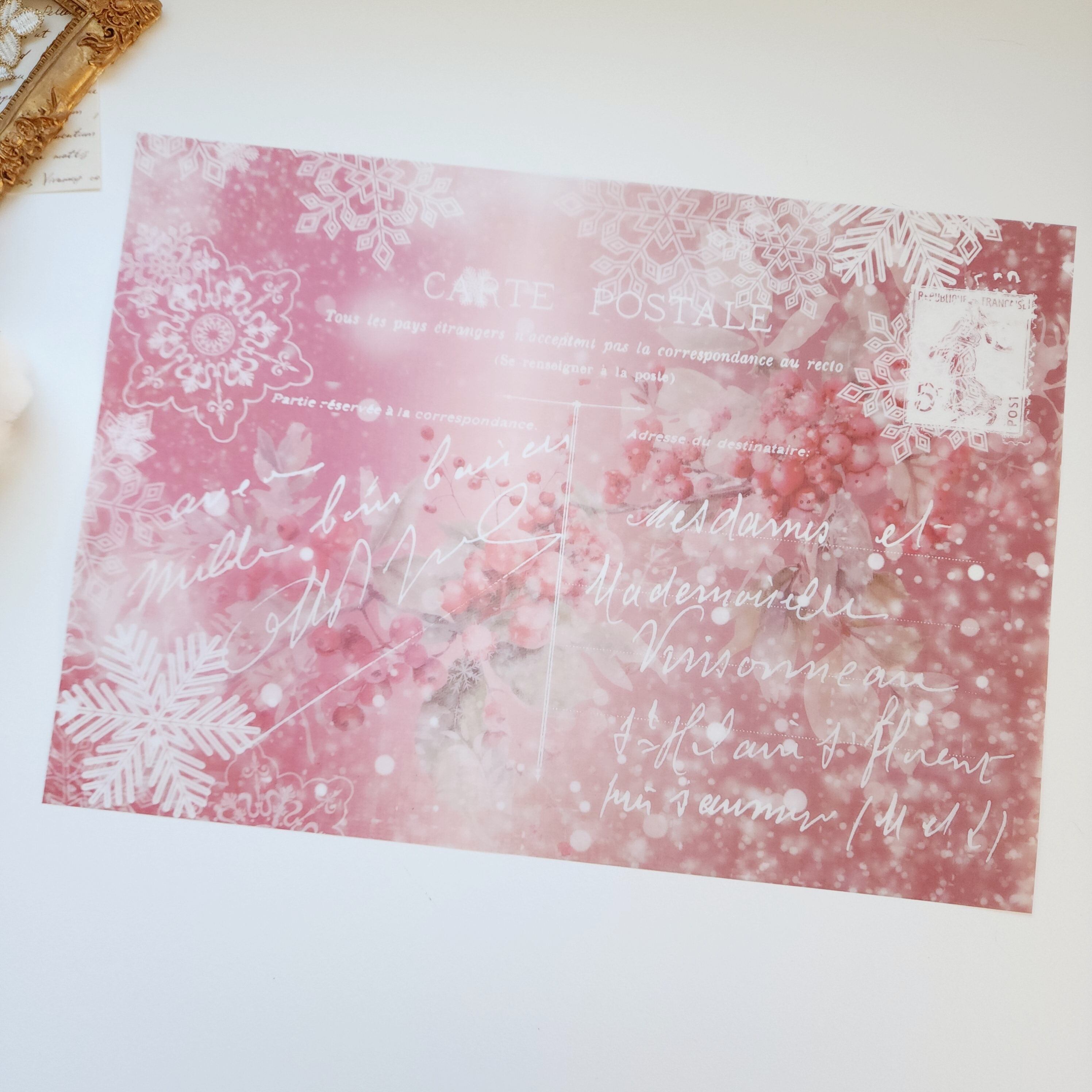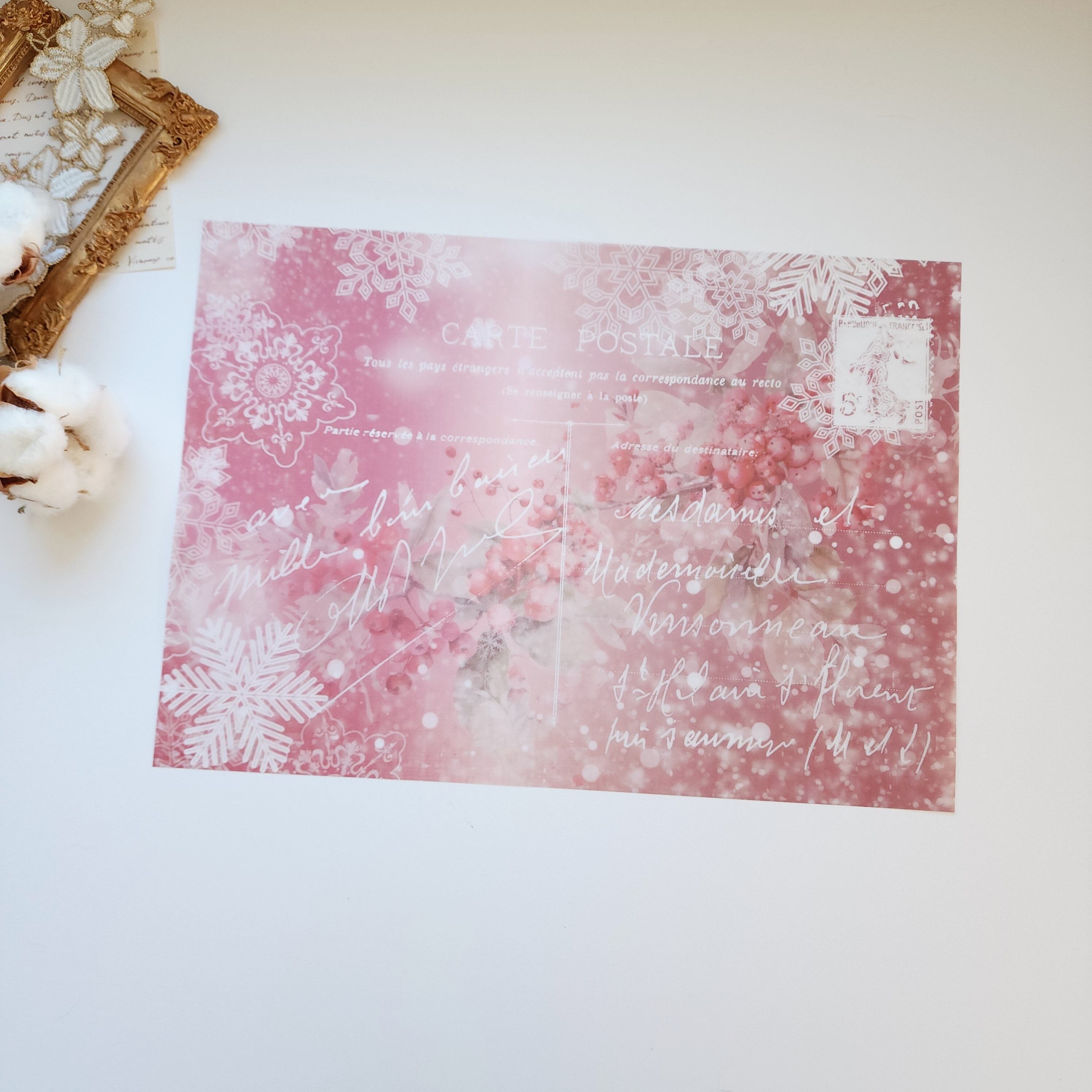 クリスマスの赤い実がうっすらと浮かぶポストカードのようなデザインに雪の結晶が舞う美しいトレーシングペーパーです。