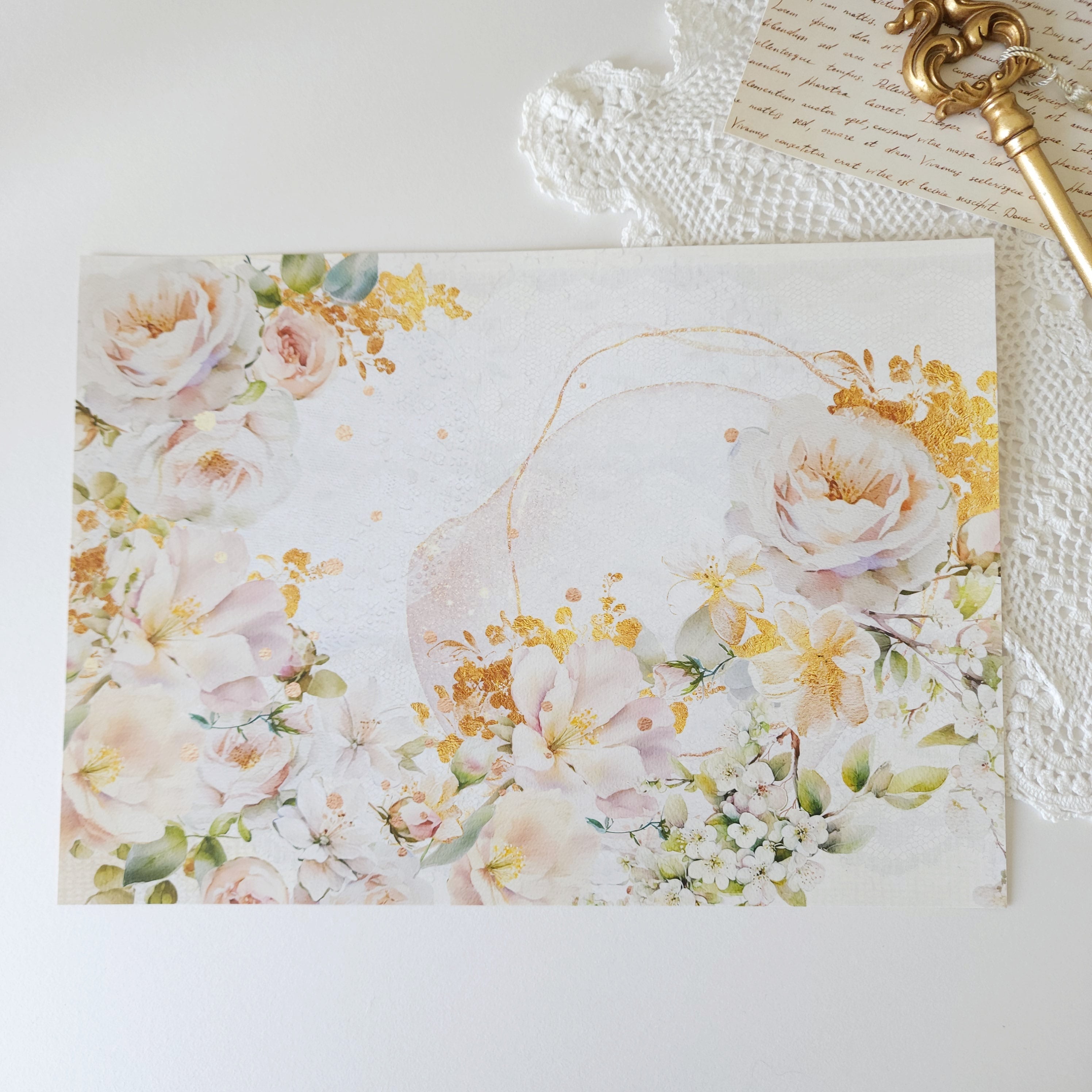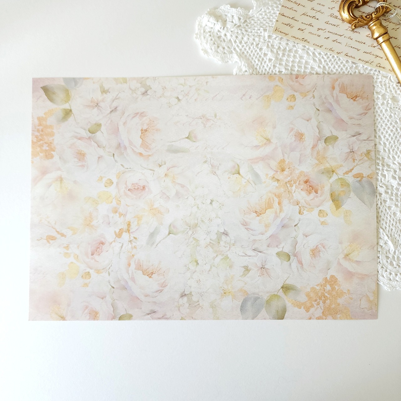 大柄の白いバラが半円を描くように囲む印象的なデザインペーパーです。